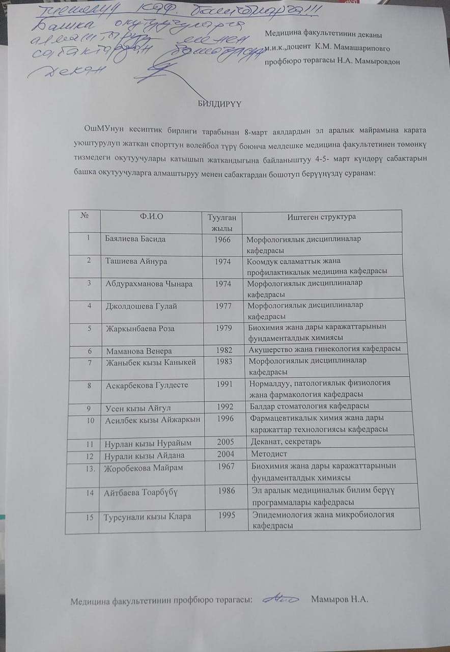 В честь международного дня женщин была проведена межфакультетское соревнование по волейболу среди женщин на котором активно участвовала преподаватель нашей кафедры Айтбаева Т.Т., медицинский факультет занял почетное 4 место.