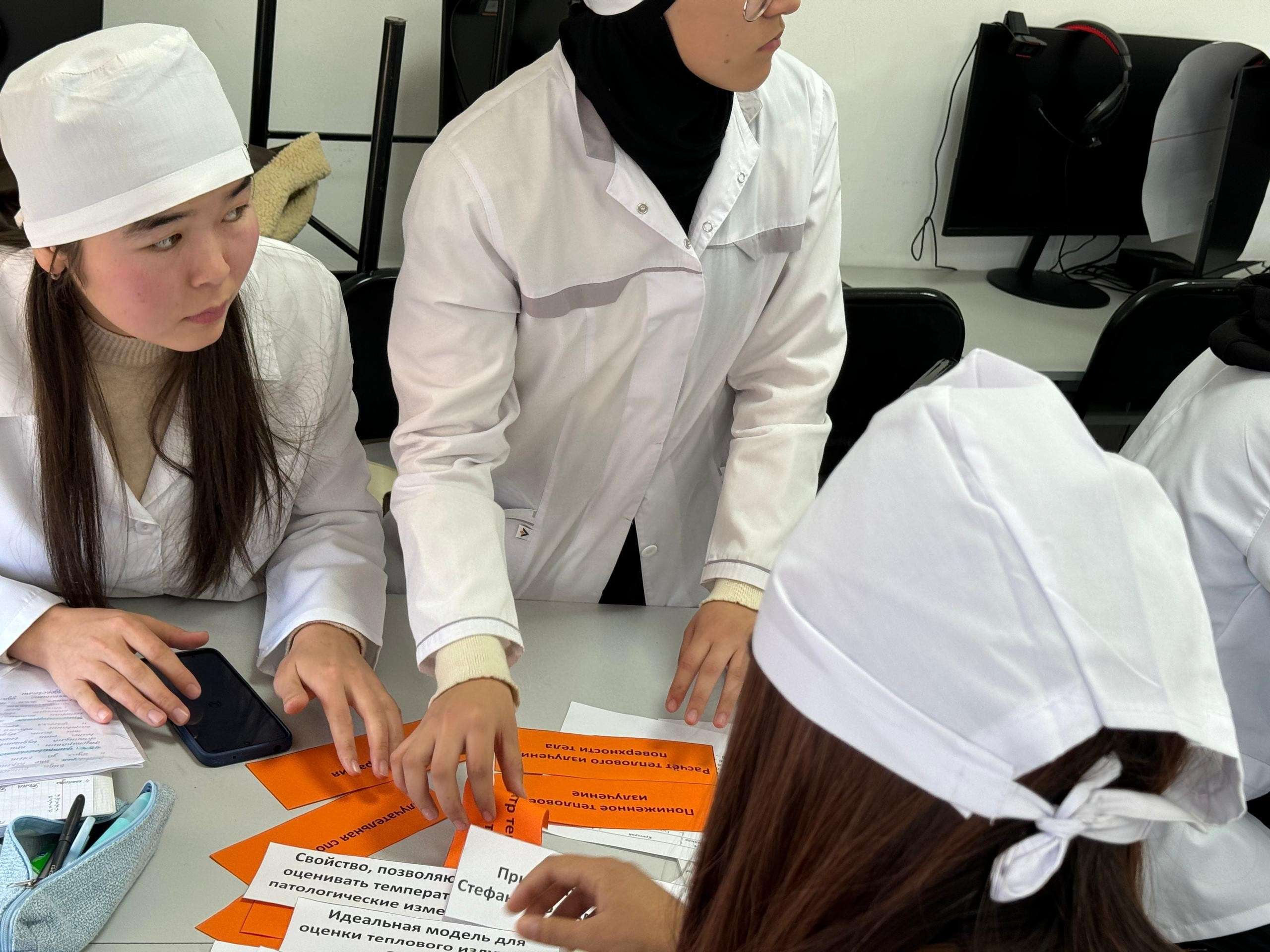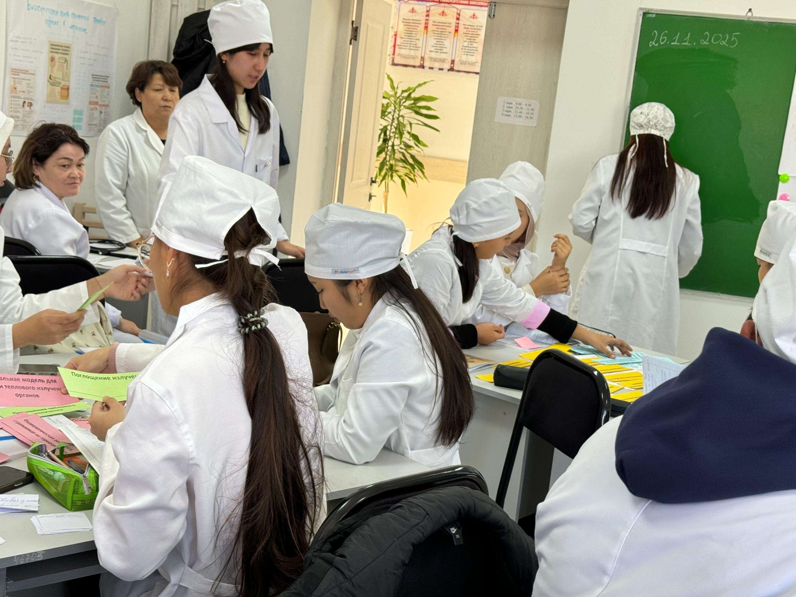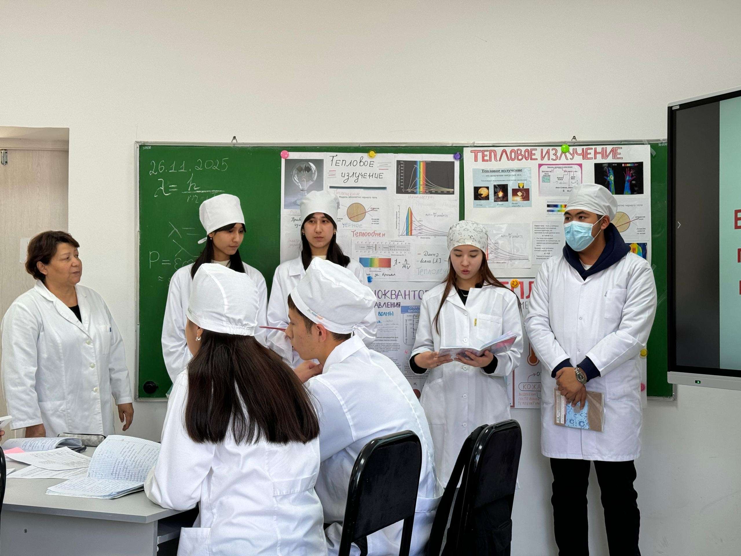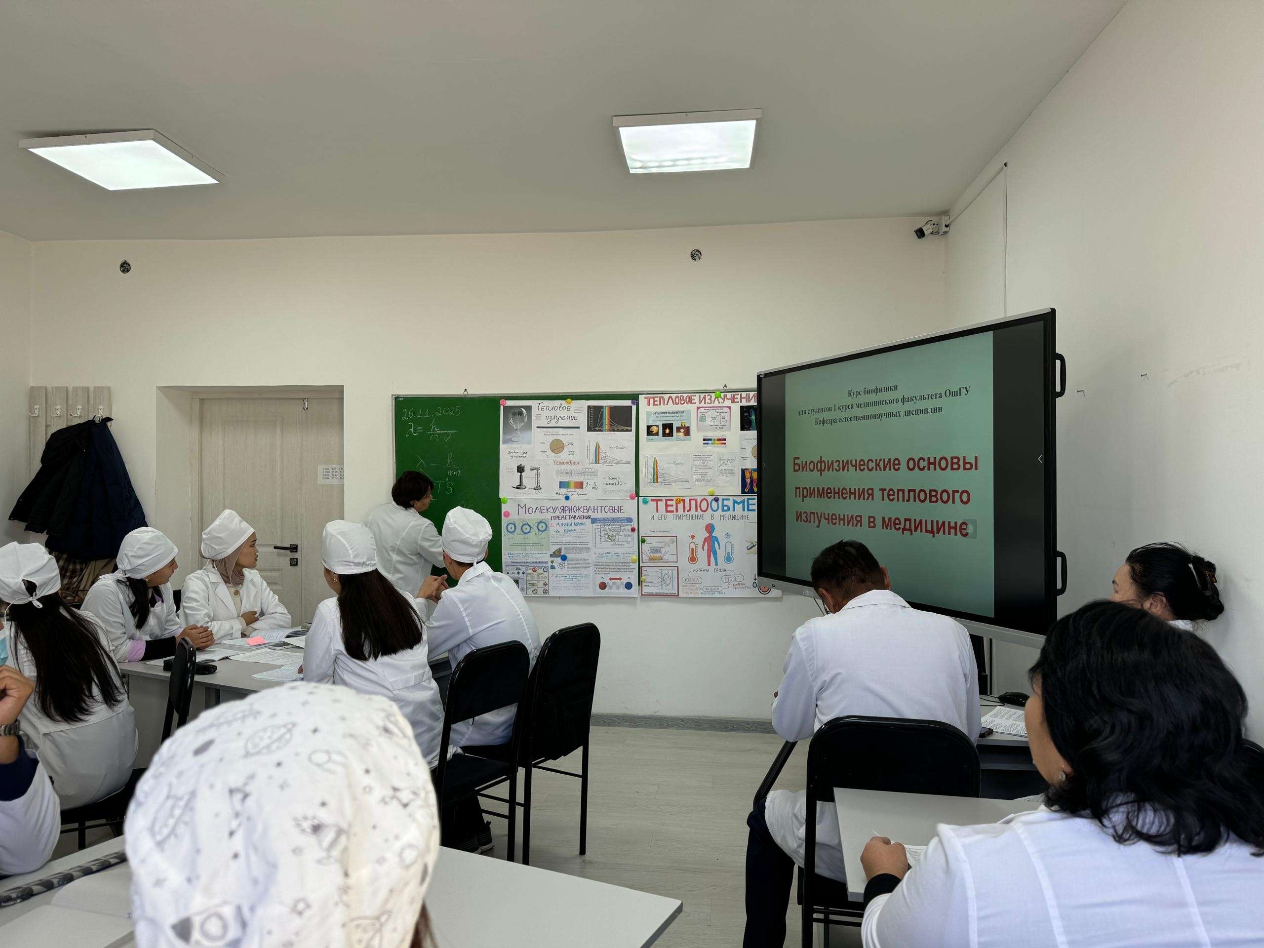26 ноября 2025 года кафедра естественнонаучных дисциплин провела открытое учебное занятие для студентов 1 курса медицинского факультета по теме «Биофизические основы применения теплового излучения в медицине» (доцент,к.ф-м.н., Садырова М.М.). Цель занятия — продемонстрировать современные методические подходы в обучении биофизике и повысить качество практической подготовки будущих врачей. В рамках занятия студенты познакомились с физическими принципами теплового излучения, теплопроводности и конвекции, а также изучили особенности температуры кожи как диагностического показателя. Практическая часть включала выполнение лабораторной работы с использованием бесконтактных и контактных термометров, инфракрасной лампы и термографического анализа. Во время лабораторного эксперимента студенты измеряли исходную температуру поверхности кожи, проводили контролируемый нагрев с помощью ИК-лампы и фиксировали изменение температуры с заданным интервалом. Полученные данные использовались для построения графика динамики нагрева и обсуждения механизмов теплопередачи в живых тканях. Особое внимание было уделено клиническим аспектам — роли тепловых процессов в диагностике воспаления, ишемии и нарушений микроциркуляции. На занятии применялись современные образовательные технологии: работа в малых группах, проблемные вопросы, обсуждение результатов исследования и самостоятельное формулирование выводов. Такой формат способствует развитию клинического мышления, навыков анализа данных и междисциплинарного понимания физиологических процессов. Кафедра выражает благодарность преподавателям и студентам, принявшим участие в мероприятии. Открытый урок подтвердил значимость практикоориентированного обучения и позволил продемонстрировать эффективные методические приёмы, направленные на повышение качества подготовки специалистов медицинского профиля.